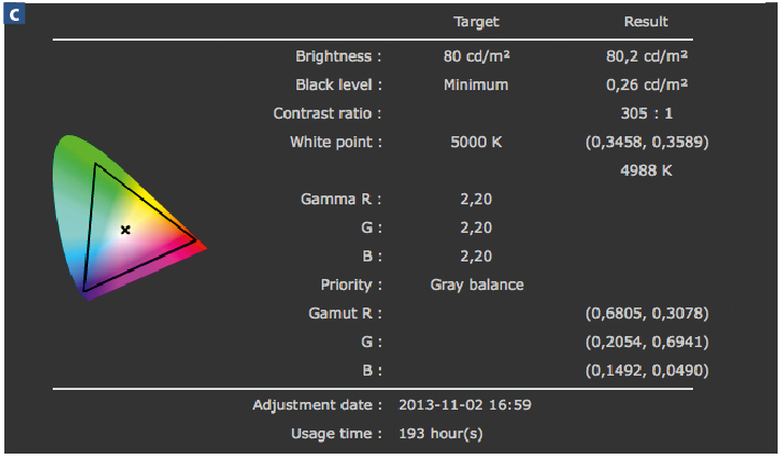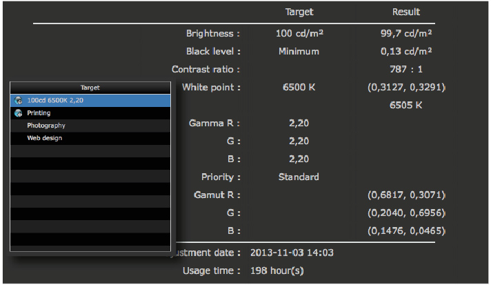 Der integrierte „SwingSensor“ klappt nun aus und die Software erzeugt eine Folge wechselnder Farben und Helligkeitsstufen, die vom Sensor ausgemessen werden. Anhand dieser Werte justiert der ColorNavigator die Look-Up-Tabellen im Bildschirm (Hardwarekalibrierung) und passt die Farbwiedergabe auf das vorgegebene Target an. Die Eckwerte dieses Resultats der Kalibrierung (in der rechten Spalte des Screenshots) sollten nun nahe bei den Vorgaben des gewählten Targets liegen. Auch das Datum der Kalibrierung ist hier angegeben – da sich die Farbwiedergabe des Bildschirms langsam ändert, muss die Kalibrierung regelmäßig wiederholt werden.