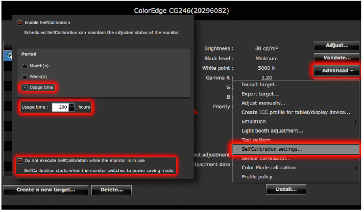 Die erneute Kalibrierung des Monitors können Sie aber auch automatisieren. Dazu klicken Sie im Hauptfenster von ColorNavigator auf »Advanced« und wählen im Pop-Up-Menü »SelfCalibration setting« aus (a). In dem Fenster, das sich daraufhin öffnet, stehen Wochen und Monate als Einheiten des Kalibrierungsintervalls zur Wahl; am sinnvollsten ist es aber, sich für eine bestimmte Betriebsdauer des Bildschirms wie beispielsweise 200 Stunden zu entscheiden. Wenn Sie einen Haken bei »Do not execute SelfCalibration while the monitor is in use« setzen, wird Sie die Automatik nicht bei der Arbeit stören, sondern den Ruhezustand abwarten.