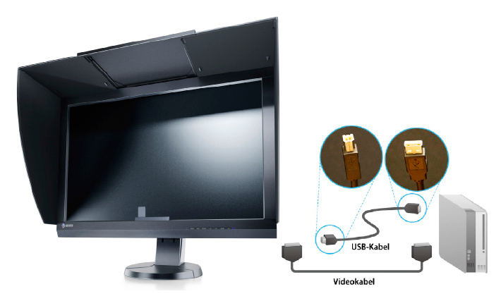 Damit Software und Monitor miteinander kommunizieren können, müssen Sie Computer und Bildschirm zusätzlich zum Videokabel mit einem USB-Kabel verbinden – wählen Sie monitorseitig den USB-Port 1.