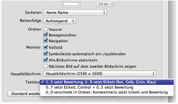Sie können sich zwar schon die Vorschaubilder im Browser sehr groß anzeigen lassen, aber Entscheidungen zur Auswahl der besten Bilder fallen bei einer bildschirmfüllenden Diaschau meist leichter. GraphicConverter bietet hier die Möglichkeit, über die Tasten 1 bis 9 Bewertungssterne und Etiketten zuzuweisen. Die Tastenbelegung schalten Sie in den Einstellungen um. Wer lieber mit der Maus arbeitet, kann Etiketten und Sterne auch in der Symbolleiste am oberen Bildschirmrand vergeben. Im Anschluss an die Diaschau stehen die Sterne oder Etiketten dann als Sortierkriterium zur Wahl.