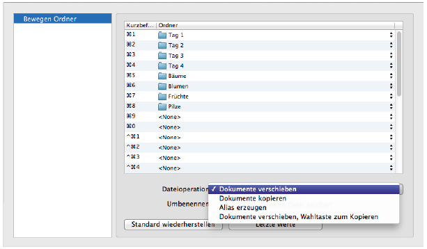 Wenn Sie Bilder in eine Reihe von Ordnern sortieren wollen, bietet sich die Ordner-Funktion von GraphicConverter an. Während der Diaschau können Sie Bilder mit einem Klick auf die Schaltflächen unten rechts am Bildschirmrand in die bis zu 30 zuvor in den Einstellungen gewählten Ordner verschieben. Alternativ lassen sich die Bilder auch über die Tastatur in einen neuen Ordner verschieben oder kopieren. Im Browser haben Sie ebenfalls die Möglichkeit, die Bilder mit der Maus aus der Vorschau in die Zielordner im linken Bereich zu verschieben. Halten Sie die »Wahltaste« gedrückt, um eine Kopie zu erzeugen.