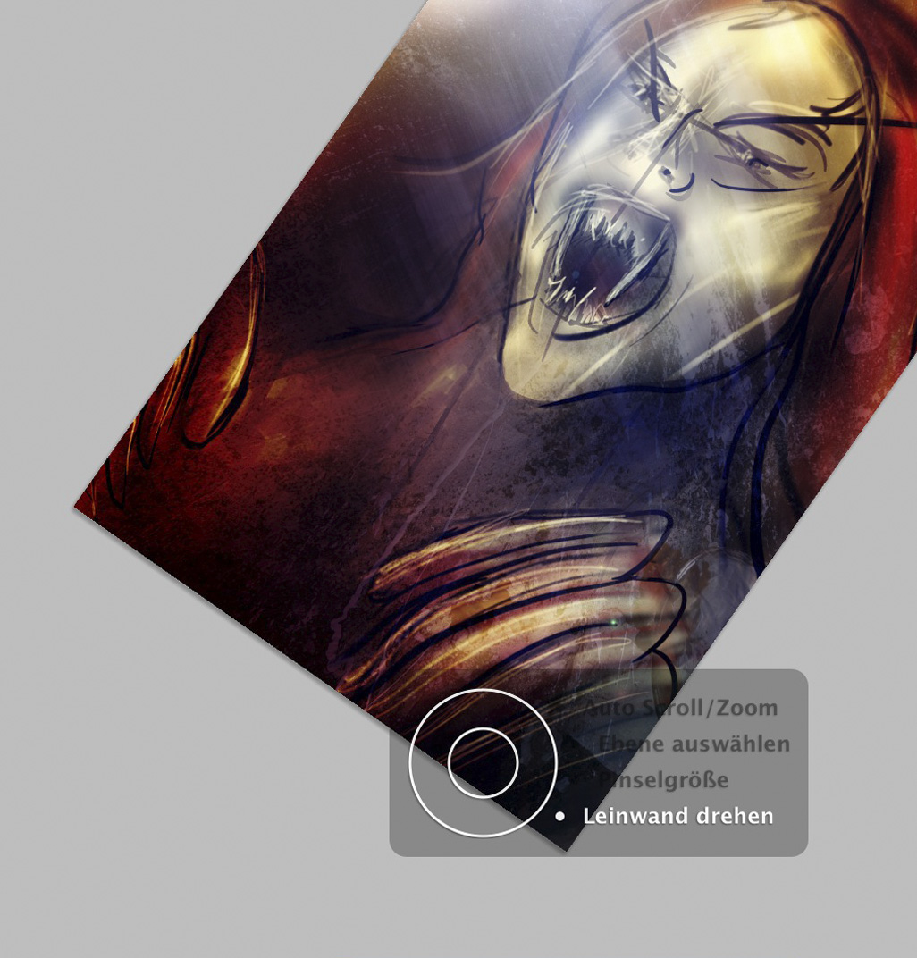 Seit Photoshop CS4 lässt sich die Arbeitsfläche drehen und so in der für das Handgelenk ergonomischsten Strichrichtung malen. Mit dem Touch Ring am Intuos 4 können Sie das jederzeit ohne Werkzeugwechsel tun. Belassen Sie im Treiber die Einstellung auf Standard und drücken Sie den mittleren Knopf des Touch Rings bis Sie „Leinwand drehen“ aktiviert haben. Mit dem Touchring drehen Sie die Arbeitsfläche. Zum Zurücksetzen der Drehung drücken Sie die Escape-Taste.