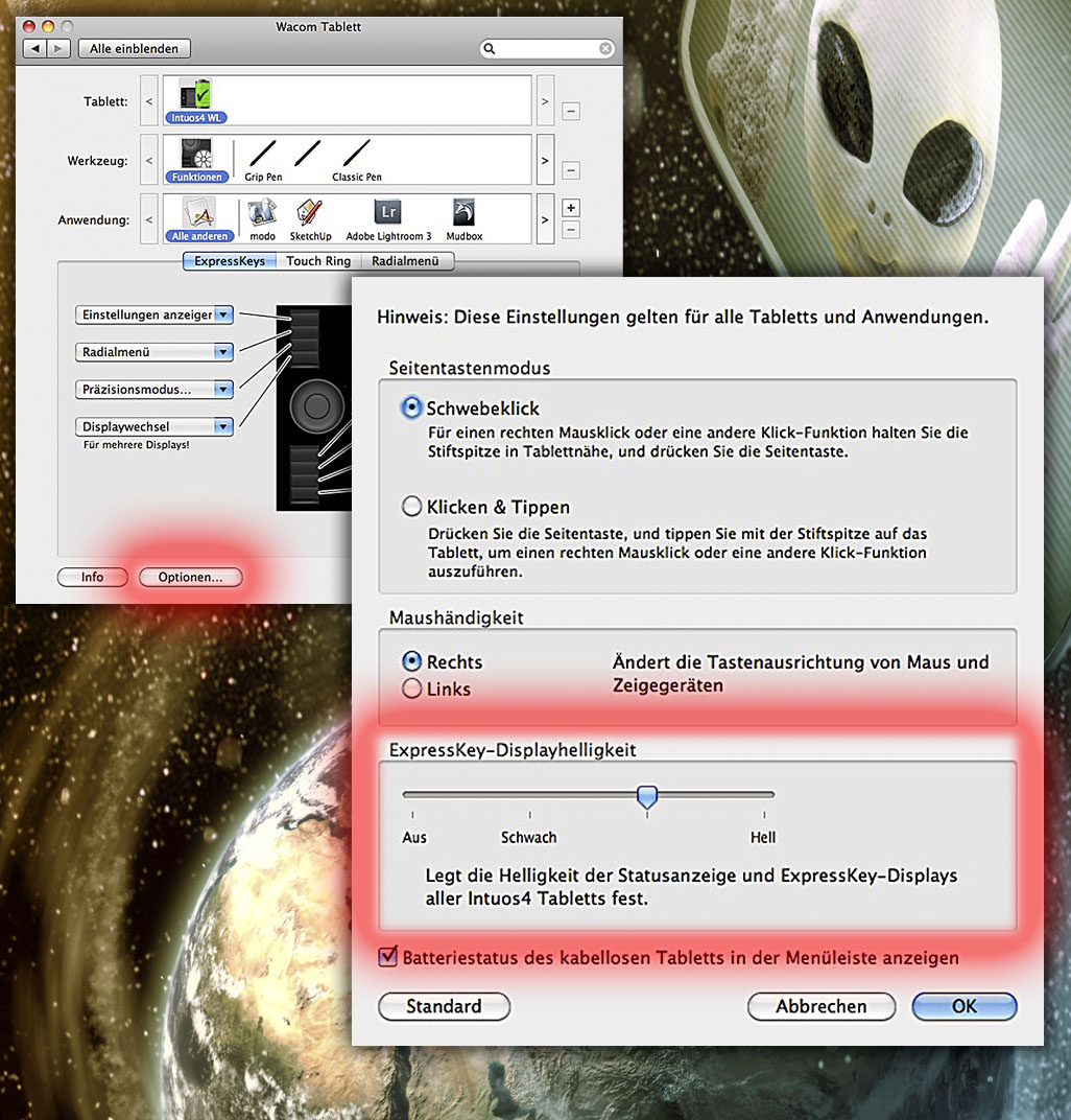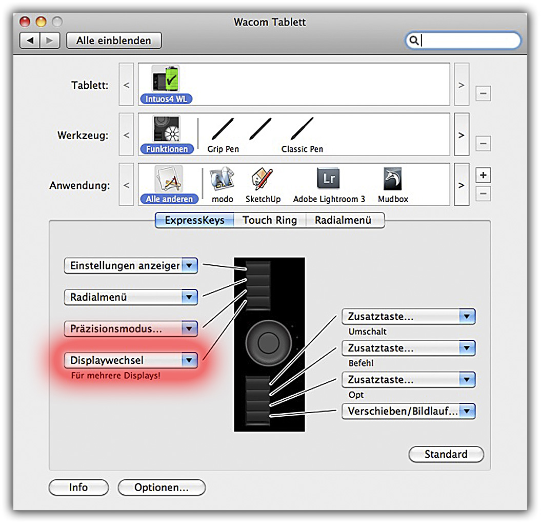 Toll, dass die ExpressKeys des Intuos4 kleine OLEDs haben, welche die Funktionsbelegung dieser Tasten anzeigen. Nur – abends sind Sie manchmal zu hell, tagsüber zu dunkel. Genau deshalb können Sie in den Wacom-Tablett-Optionen die Helligkeit der Anzeige regulieren oder – falls Sie das wirklich möchten – auch ganz ausschalten.
