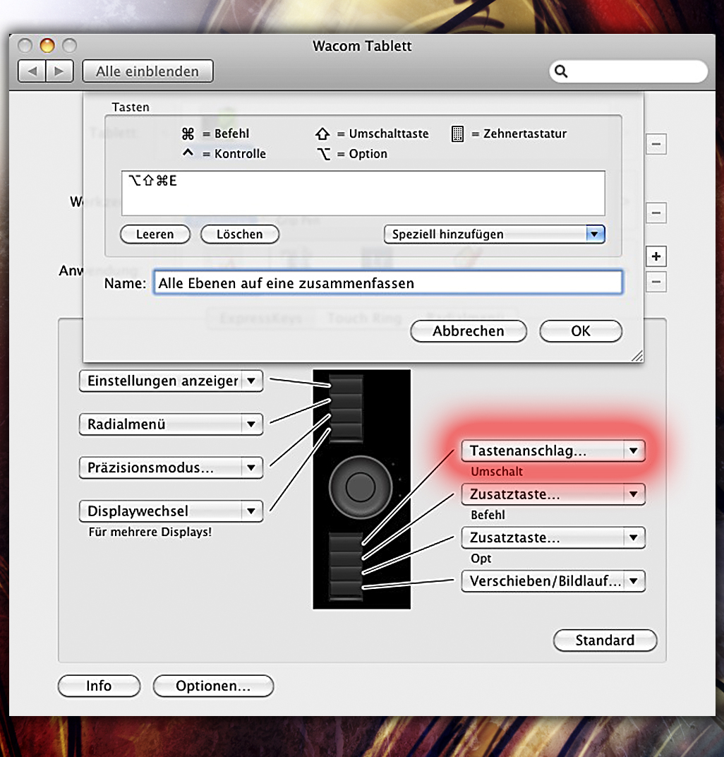 Mit „Strg-/Befehl-Alt-Shift-E“ können Sie alle Ebenen zu einer neuen Ebene zusammenfassen. Ein sehr praktischer Shortcut, der jedoch etwas Fingerakrobatik erfordert, will man ihn mit nur einer Hand ausführen. Legen Sie derartige „Monster-Shortcuts“ doch auf die Express-Tasten des Tabletts. Im Wacom-Treiber stellen Sie hierzu auf „Tastenanschlag“, geben das Tastaturkürzel und einen passenden Namen ein und fortan benötigen Sie nur noch einen einzelnen Fingerdruck für diese Aktion.