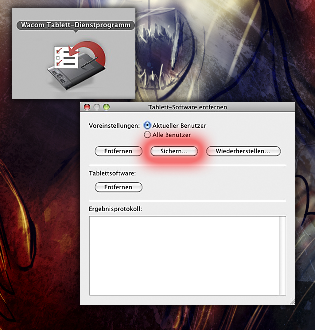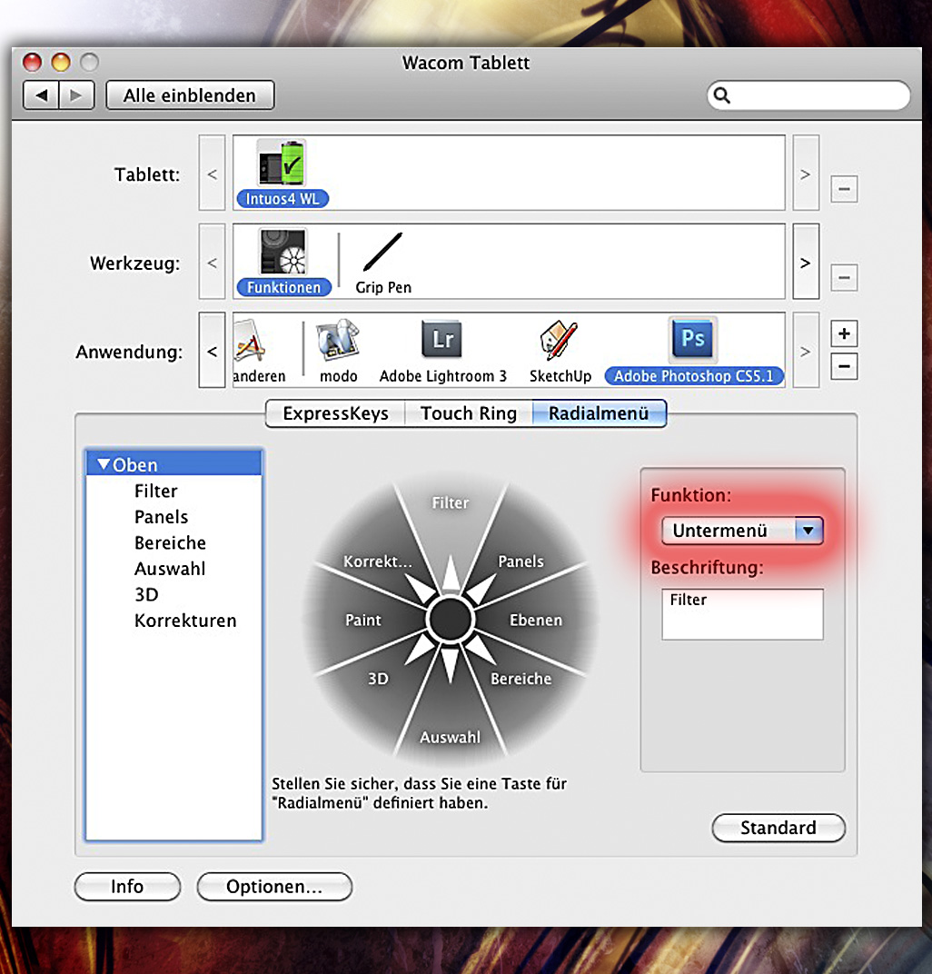 Oft vermissen Anwender die Möglichkeit, die Einstellungen im Wacom-Treiber (Expresskeys, Empfindlichkeit, Projektion, Radialmenüs …) zu sichern oder auf einen anderen Rechner zu übertragen. In den Systemeinstellungen werden Sie vergebens nach einer Lösung suchen. Diese finden Sie im Wacom Tablett-Dienstprogramm, das Sie unter „Programme?>?Wacom Tablett“ aufrufen können.