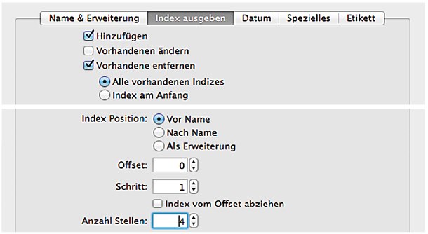Wenn Sie eine Auswahl von Bildern mit einer neuen Zählung versehen wollen, wählen Sie unter dem Reiter »Index ausgeben« die Funktionen »Hinzufügen« und »Vorhandene entfernen«. Geben Sie als Anzahl der Stellen 4 ein, wenn der Index maximal vierstellig wird. Falls der Indexzähler nicht bei 1 beginnen soll, können Sie unter »Offset« angeben, wie viele Nummern übersprungen werden sollen. Der neue Index wird wahlweise vor oder nach dem Namen eingefügt. Ein durchgehender Index kann die weitere Verarbeitung vereinfachen und wird von vielen Videoprogrammen erwartet, die aus Einzelbildern Filme erstellen.