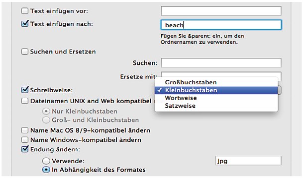 Unter dem Reiter »Name & Erweiterung« können Sie mit »Schreibweise« sämtliche Großbuchstaben in Kleinbuchstaben wandeln, wie es manche Webserver erfordern. Wenn Sie mit »Text einfügen« einen beliebigen Text nach dem Dateinamen einfügen, sollten Sie ein Trennzeichen wie das Minuszeichen oder ein Leerzeichen vor den Text setzen. Die Funktion »Suchen und Ersetzen« ist praktisch, wenn Sie einen größeren Bildbestand kaufen und den alten Eigentümernamen in den Dateinamen gegen Ihren eigenen austauschen wollen. Falsche Dateiendungen lassen sich mit »Endung ändern: In Abhängigkeit des Formates« korrigieren.