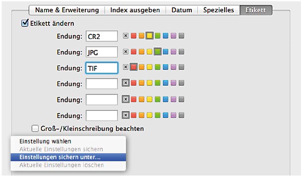 Ein beliebtes Mittel zur Kennzeichnung von Dateien sind die Etiketten. Unter dem Reiter »Etikett« können Sie allen Dateien mit einer bestimmten Endung ein Etikett zuweisen oder dieses löschen lassen. Geben Sie jeweils eine Dateiendung in das Feld »Endung« ein und wählen Sie das zuzuweisende Etikett. Normalerweise wird nicht zwischen Groß- und Kleinschreibung der Dateiendung unterschieden, aber mit der Option »Groß-/ Kleinschreibung beachten« lässt sich das ändern. Unten links im Dialog können Sie die aktuellen Einstellungen sichern, um sie später wiederzuverwenden. Sie stehen dann auch beim Import von Bildern zur Verfügung.