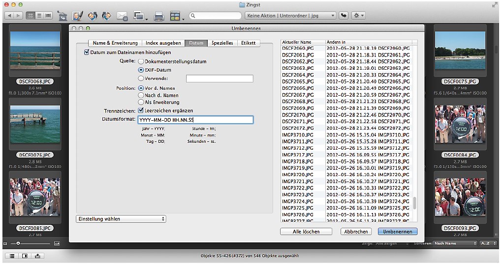 Die Funktion »Umbenennen« ist vielfätig nutzbar, etwa um Bilder, die mit mehreren Kameras von einem Ereignis gemacht wurden, einheitlich zu benennen. Dazu können Sie den Dateinamen das Aufnahmedatum und die Uhrzeit voranstellen, sodass alle Bilder in chronologischer Folge sortiert werden. Die Bilddateien lassen sich aber auch einfach durchnummerieren, der Name des Fotografen hinzufügen oder die Dateinamen um Metadaten wie Kamerahersteller und -modell erweitern.