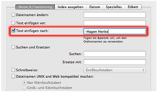 Wer seine Bilder an Zeitungen und Verlage weitergibt, kennt möglicherweise folgendes Problem: Am Bild beziehungsweise im Impressum wird statt des Fotografen nur „Foto: privat“ angegeben, weil sich Redakteure nicht immer die Mühe machen, in den IPTC-Metadaten oder der Korrespondenz nachzuschauen. Daher empfiehlt es sich für Fotografen, unter dem Reiter »Name & Erweiterung« den eigenen Namen mit »Text einfügen nach« am Ende des Dateinamens einzufügen. Diese Position ist vorteilhaft, weil beispielsweise die Verknüpfungspalette von InDesign den mittleren Teil von langen Dateinamen durch drei Punkte ersetzt, wenn nicht genügend Platz vorhanden ist.