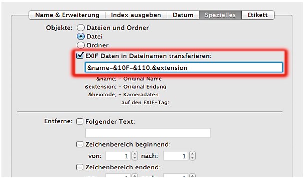 Um Aufnahmeparameter aus den EXIF-Metadaten in den Dateinamen einzufügen, wählen Sie unter dem Reiter »Spezielles« die Option »EXIF Daten in Dateinamen transferieren« und geben im Eingabefeld den Hexadezimalcode des gewünschten EXIF-Tags mit vorangestelltem „&“ ein. Dies funktioniert allerdings nur mit EXIF-Tags, die Text enthalten. Wenn Sie in einem Ordner Bilder von verschiedenen Fotografen mit verschiedenen Kameras erhalten, können Sie mit „&10F“ den Hersteller, mit „&110“ das Kameramodell und mit „&13B“ den Namen des Fotografen in den Dateinamen einfügen, um die Bilder danach zu sortieren.