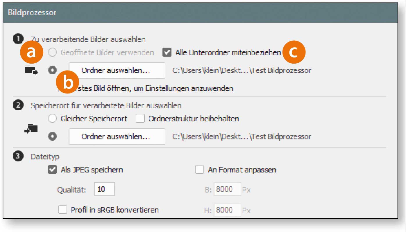 Wenn Sie dagegen einen »Ordner auswählen« (b), können Sie »Alle Unterordner einbeziehen« (c). Je nach Ordnerstruktur können Sie damit viel Zeit sparen, da Sie nicht jeden Ordner einzeln verarbeiten müssen.