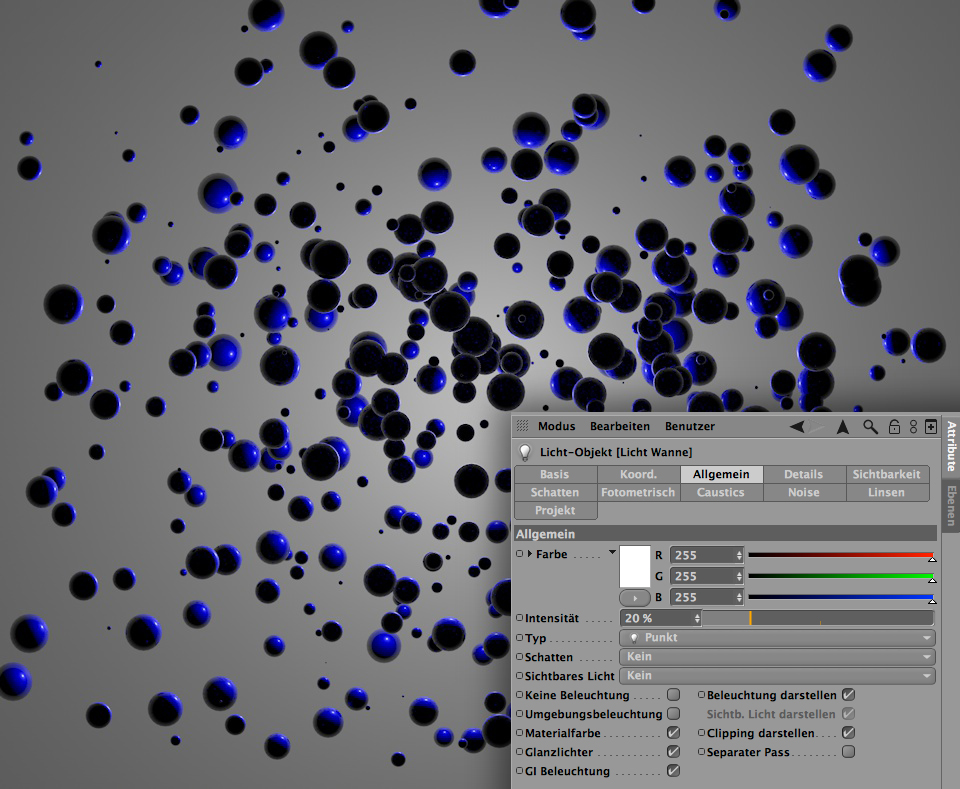 Eigentlich müsste man meinen, dass ein »Fläche«-Schatten das Nonplusultra eines physikalisch korrekten Schattens darstellt. Ist auch fast so. Was aber fehlt, ist der kleine, tiefschwarze Schatten unmittelbar am Auflagepunkt eines Objektes. Auch dieser »Ambient Occlusion« genannte Körperschatten ist ein Effekt, den Sie zumindest für das finale Rendern einer Szene dazubuchen sollten, auch wenn er Renderzeit kostet. Die AO ist vor allem dann wichtig, wenn ein Gegenstand im Schatten eines anderen liegt. Da die Lichtquelle den verdeckten Gegenstand nicht „sehen“ kann, erhält er auch keinerlei eigenen Schatten zugeordnet und wirkt so seltsam fremd und an der Szene unbeteiligt: Die Kugel in der rechten Bildhälfte, die zwischen den beiden größeren Kugeln liegt, demonstriert dies. Während alle anderen Kugeln eine AO besitzen, wurde dieser Kugel die AO per »Render-Tag« entzogen. »Render-Tag«?