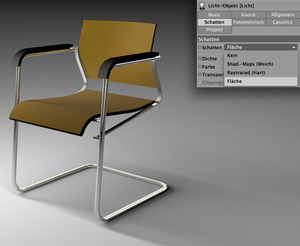 Die zweite wichtige Eigenschaft einer realen Lichtquelle ist die Tatsache, dass man sie zum Schattenwurf nutzen kann. Genaugenommen ist natürlich nicht die Lichtquelle, sondern das Objekt im Strahlengang der Lichtquelle für den Schatten verantwortlich. Dessen Charakteristik hat jedoch viel mit der Größe und der Entfernung des Lichtes zu tun. Cinema 4D bietet gleich drei unterschiedliche Schattentypen an: Zunächst sind da die weiche »Shadow Map«, die am besten bei großen, simplen Objekten funktioniert, und der harte Schatten, der eine einfache Projektion aus der Richtung der Lichtquelle darstellt. Beide sind schnell zu berechnen, aber physikalisch nicht korrekt. Deshalb gibt es die dritte, rechenintensive, aber dafür sehr realistisch wirkende Schattenart, den sogenannten »Fläche«-Schatten (siehe Abbildung). Den sollten Sie aber erst zum finalen Rendern verwenden, für Testzwecke reichen die beiden anderen „schnellen“ Schattentypen vollkommen aus.