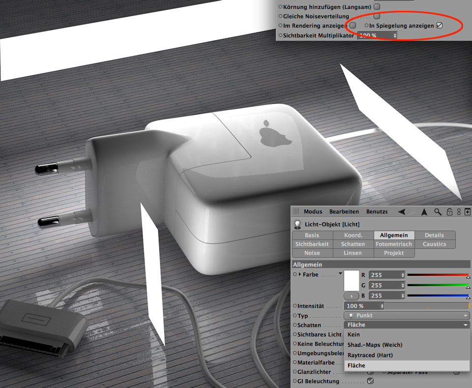 Neben diesen beiden essenziellen Attributen, der Abnahme und dem Schatten, spielt die Form der Lichtquelle die wichtigste Rolle beim Beleuchten einer Szene. Speziell dann, wenn Sie Lichtkanten auf Glanzobjekte setzen wollen, kommen Sie um ein Flächenlicht kaum herum. Das verhält sich allerdings zunächst nur in Bezug auf seine Schatten wirklich flächig – Reflexe werden nach wie vor punktförmig wiedergegeben, denn sie werden lediglich durch die Einstellungen im Glanzlichtkanal des beleuchteten Materials bestimmt. Abhilfe schafft ein kleines Häkchen, welches Sie auf der Detailsseite unter »In Spiegelung anzeigen« setzen. Dort können Sie auch festlegen, ob die Lichtquelle selbst zu sehen sein soll oder nur deren Spiegelung. Übrigens: Wenn Sie die Spiegelung im Glanzobjekt sehen, können Sie den Glanzlichtkanal des entsprechenden Materials abschalten, den brauchen Sie nun nicht mehr.