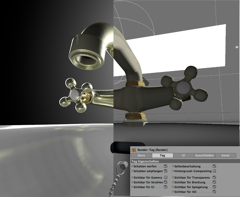 Das »Render-Tag« ist ein Tag, das nicht nur in Zusammenhang mit Lichtwerkzeugen sinnvoll ist. Es ist vielmehr ein unscheinbares, aber mächtiges Werkzeug, welches fast in jeder Szene in irgendeiner Weise seine Finger im Spiel hat. Das »Render-Tag« wird Objekten im Objektmanager zugeteilt und bestimmt deren Eigenschaften mit. Im Falle der gesperrten AO wurde einfach das Häkchen für die AO entfernt. Häufiger jedoch wird dieses Tag eingesetzt, um Objekte unsichtbar zu machen. Das lohnt sich besonders dann, wenn man einen unverzichtbaren, aber störenden Aufheller in der Kamera sehen kann wie im Beispiel rechts. Da die Wirkung des Aufhellers, also seine Sichtbarkeit für Strahlen (GI, AO etc.) unabhängig von seiner Sichtbarkeit für die Kamera ist, kann er aus dem Bild entfernt werden, ohne seine Wirkung einzubüßen. Das »Render-Tag« finden Sie im Menü des Objektmanagers unter »Tags > Cinema 4D-Tags«.