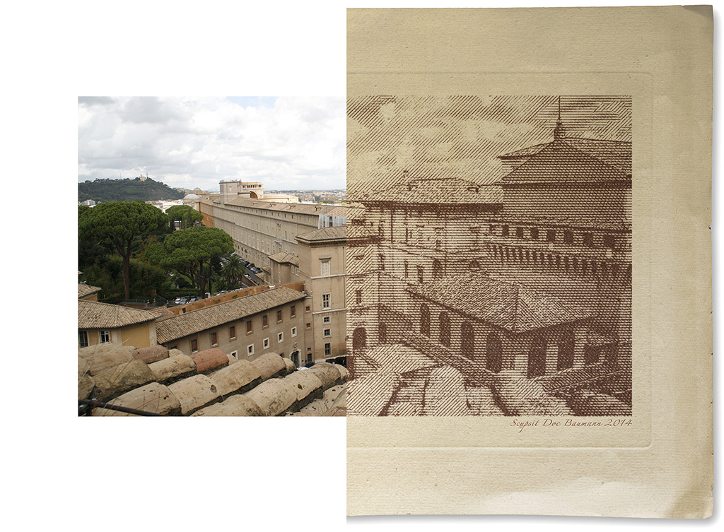 Der Grund: Gestochene Linien haben eine doppelte Funktion. Zum einen sind es Konturlinien, die Objekte oder Objektteile umranden – zum anderen dienen sie als Schraffuren dazu, zu schattieren. Bei herausragenden Kupferstechern überkreuzen sich diese Schraffurlinien aber nicht (nur), sondern sie werden zum einen je nach Helligkeitsgrad dicker oder dünner (vergleiche etwa Abb. 14 von Francesco Piranesi), zum anderen folgen sie den Oberflächenwölbungen. Das ist eine Leistung, die – einstweilen – nur ein geübter Künstler umsetzen kann; Photoshop ist als Werkzeug damit jedenfalls überfordert.