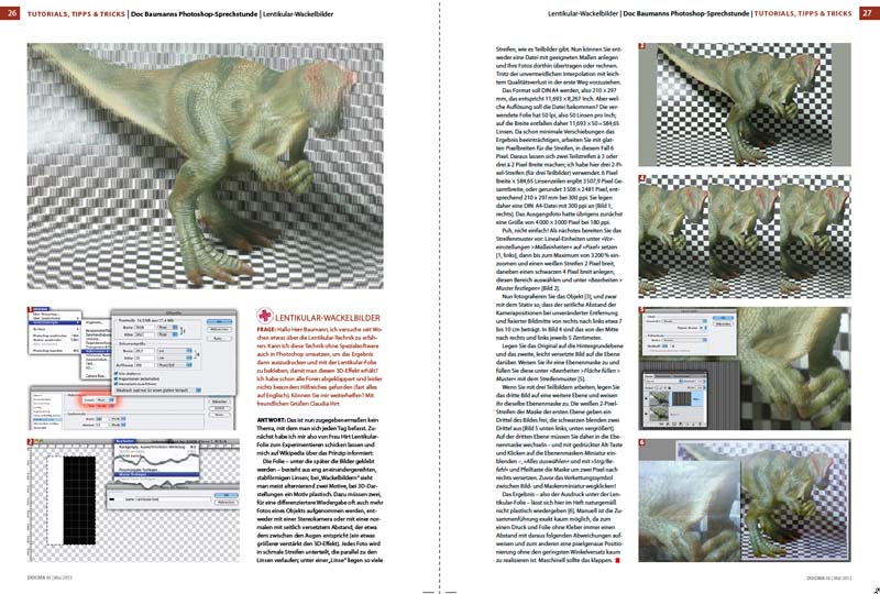 Photoshop-Sprechstunde Diesmal beantwortet Doc Baumann folgende Leserfragen: Wie lässt sich eine Bilddatei mit vielen Ebenen, Kanälen und Pfaden schnell als Bild ohne all diese Komponenten duplizieren? Wie setzt man den Colorkey-Effekt um? Auf welche Weise entstehen spiralförmig verdrehte Zifferblätter? Kann man in Photoshop ein zylindrisches Objekt naturgetreu spiegeln? Eignet sich das Programm auch zum Vorbereiten von Druckdateien für Lentikularfolien (Wackelbilder)?