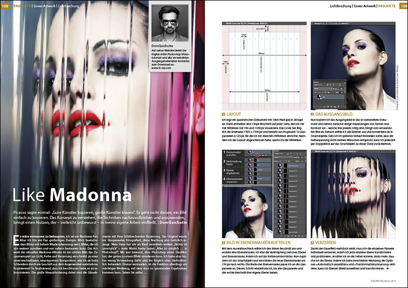 Like Madonna Das Cover-Motiv des aktuellen Madonna-Albums wurde durch Glaspaneele fotografiert, die sich im Bild als Verzerrungen und Farbverschiebungen zeigen. Der Digitalkünstler Dom Quichotte erklärt, wie man diesen Effekt mit dem Glasfilter von Photoshop erzeugt.