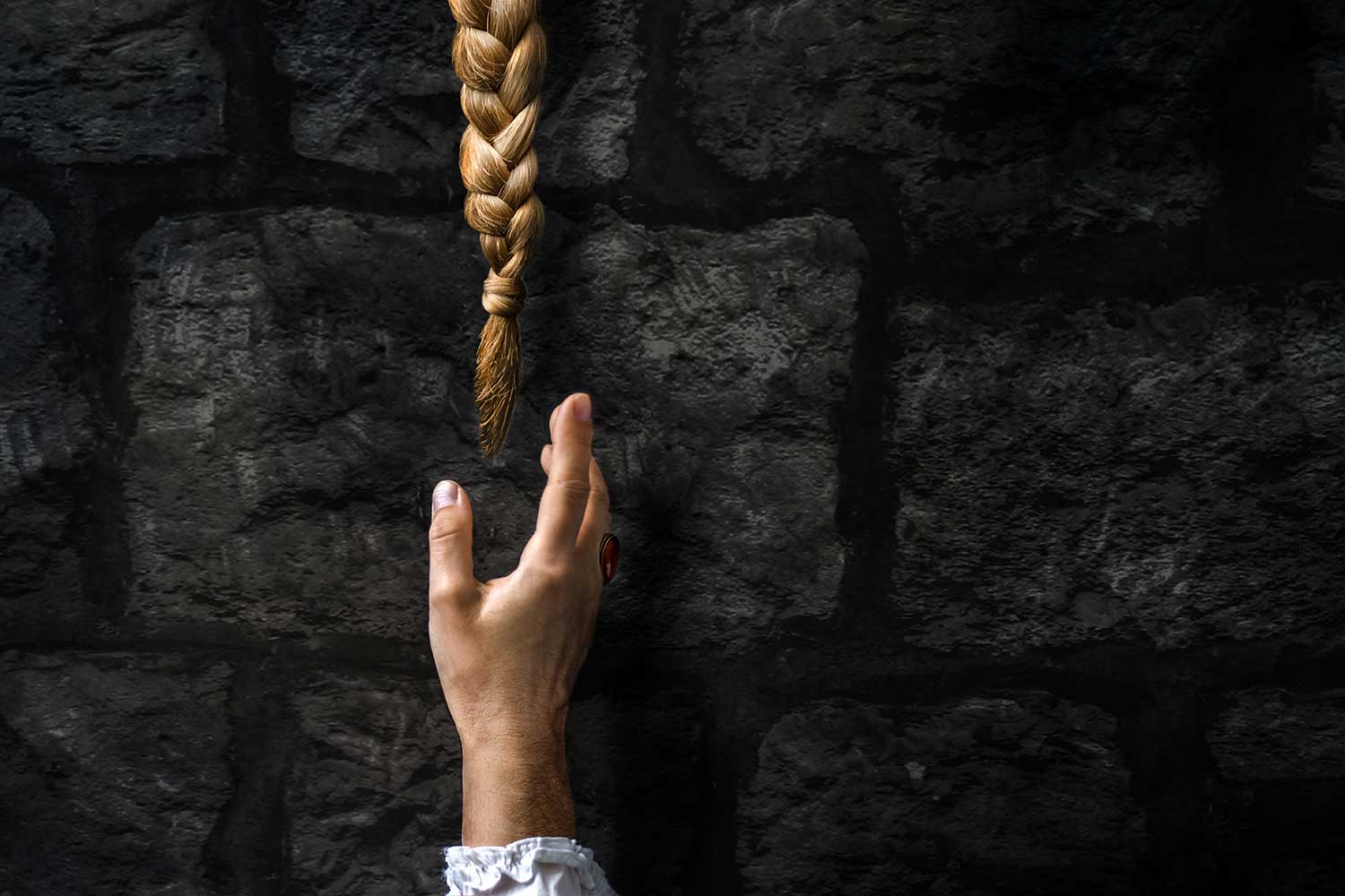 Die liebe „Rapunzel“ war entgegen meiner Erwartungen eines der schwierigsten Bilder. Denn man muss erst einmal eine Mauer finden, auf die sich das Model (hier: meine Schwester) so hinlegen kann, dass der Zopf schön gerade (!) herunterhängt. Fälschlich war ich bei der Planung davon ausgegangen, ich könnte meine Hand als die eines starken Prinzen ausgeben. Wir haben dann in der Not einen netten Passanten gefragt, ob er uns seine Hand für ein Foto leihen würde. Trotz des großen Einsatzes wollte das mit der Handhaltung aber einfach nicht gelingen. Ist wohl doch schwerer als gedacht, diese Prinzenhandgeste. Am Ende wurde es dann doch meine eigene Hand, die ich mit Hilfe des Verflüssigen-Filters einfach etwas kräftiger gemacht habe. Dann habe ich noch schnell ein ein paar Adern und Armhaare des netten jungen Mannes eingebaut und voilà: fertig war die Prinzenhand.