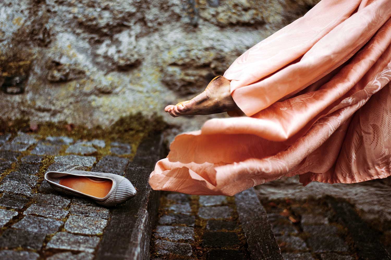 Für das „Aschenputtel“ war es ganz klar, dass ein fallender Schuh und eine Treppe zu sehen sein müssen – ein schmutziger Fuß und das Stück eines schönen Kleides komplettierten für mich die Szene.