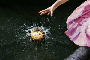 Für das Märchen vom „Froschkönig“ war natürlich die goldene Kugel besonders wichtig. Die Textpassage „Nun trug es sich einmal zu, dass die goldene Kugel der Königstochter nicht in ihr Händchen fiel, das sie in die Höhe gehalten hatte.“ passte. Allerdings wollte ich die Kugel ins Becken platschen lassen, so dass der nächste Teil des Originaltextes „sondern vorbei auf die Erde schlug und geradezu ins Wasser hineinrollte“ wegfallen musste. Eine alte silberne Kugel aus den Deko-Beständen meiner Mutter habe ich bei uns im Gartenhaus gefunden. Im elterlichen Garten gibt es auch einen kleinen Fluss, der es einfach machte, die Andeutung eines Brunnens ins Bild zu bringen. Bis die Kugel dann wirklich so ins Wasser gefallen ist, dass die Spritzer und die Reflexionen in der Kugel-Oberfläche toll aussahen, hat es eine Weile gedauert. Handhaltung und Kleiderfalten mussten gleichzeitig auch noch passen, da kann die Produktion eines einfach aussehenden Bildes schon mal zwanzig Minuten in Anspruch nehmen. Auch färbte ich nachträglich die silberne Kugel in Photoshop golden um und änderte die Farbe des Kleides, bei dem es sich um den gleichen Vorhang wie beim Schneewittchen-Bild handelt. Der Brunnenrand stammt aus einem meiner Reisebilder.