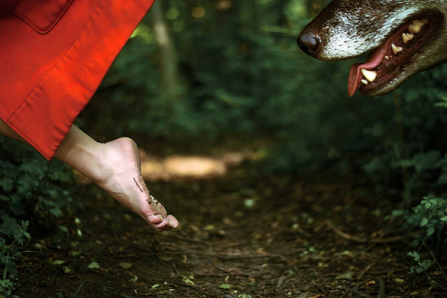 Mein erstes Märchenbild war das „Schneewittchen“. Ein Zitat im Text, das die zentrale Szene beschreibt, war schnell gefunden. Selbstverständlich durften im Bild das Ebenholz-Haar und ein Stückchen schneeweiße Haut nicht fehlen. Außerdem der berühmte vergiftete Apfel – angebissen natürlich. Beim Requisitenbauen habe ich gelernt, wie schwierig es ist, einen Apfel „schön“ anzubeißen. Und dann muss man sich auch noch sehr beeilen mit dem Fotografieren, sonst wird die Bissstelle braun. An dieser Stelle gestehe ich vielleicht auch einfach, dass es der zweite Apfel war, den man jetzt auf dem Foto sieht. Jedenfalls habe ich das Bild als Selbstporträt im Wohnzimmer realisiert. Gerade bei diesem ersten Motiv habe ich viel ausprobiert, was auf dem Foto zu sehen sein muss und was nicht. Am Ende haben mir zum Beispiel die Augen vom Gesicht ausgereicht. In der Nachbearbeitung musste ich den Parkettboden durch Abdunkeln und Entsättigen etwas altern lassen, weil ein nagelneues Parkett einfach nicht zu einer Waldhütte passt. Ansonsten habe ich an diesem Bild nur ein wenig den Kontrast erhöht. Eine reine Lightroom-Bearbeitung also.