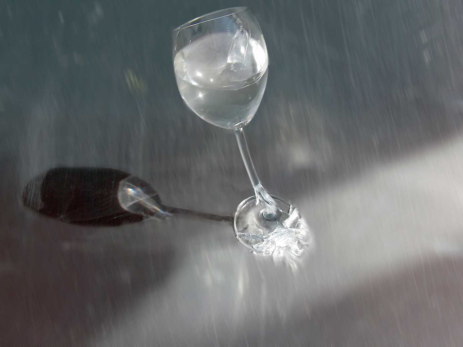 Ich möchte Ihnen das an zwei Beispielen demonstrieren. Mein Foto oben links erzählt eine kurze Geschichte – wenn auch keine besonders spannende, eher eine neutrale, die nur das Prinzip verdeutlichen soll: Ein Weinglas zerbricht; der obere Teil ist intakt, der Stiel löst sich von der Standfläche, die gerade zersplittert. Der Betrachter benötigt lediglich seine Alltagserfahrung, um die komplette Handlung zu rekonstruieren: Das Glas ist zuvor – warum auch immer – heruntergefallen, es wird im nächsten Augenblick zerschellen und sein Inhalt wird sich über den Boden ergießen.
