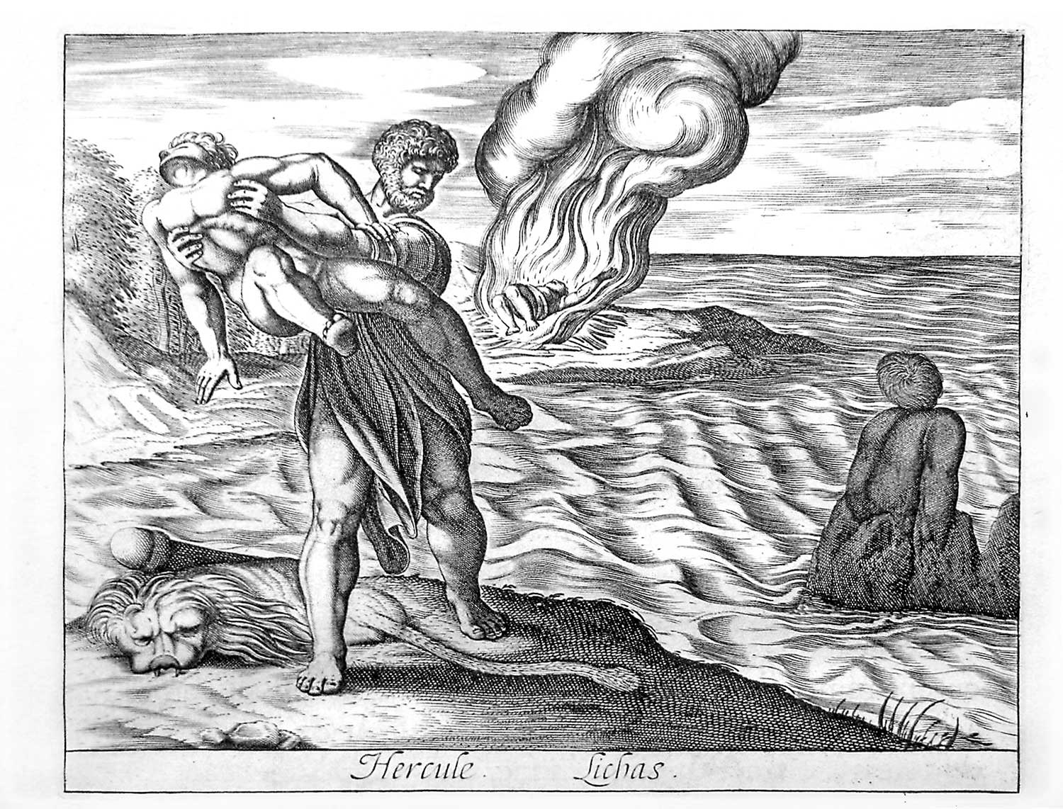 Doch die Notwendigkeit des Vorwissens ist nicht der einzige Unterschied. Der Stich erzählt die Geschichte zwar in einem Bild – aber das ist kein Schnappschuss, sondern es enthält drei zeitlich gestaffelte Stationen: Der rasende Herkules hebt Lichas empor (1), er schleudert ihn ins Meer, wo er zu einem Felsen erstarrt (2); dann errichtet Herkules den Scheiterhaufen und verbrennt sich selbst (3).