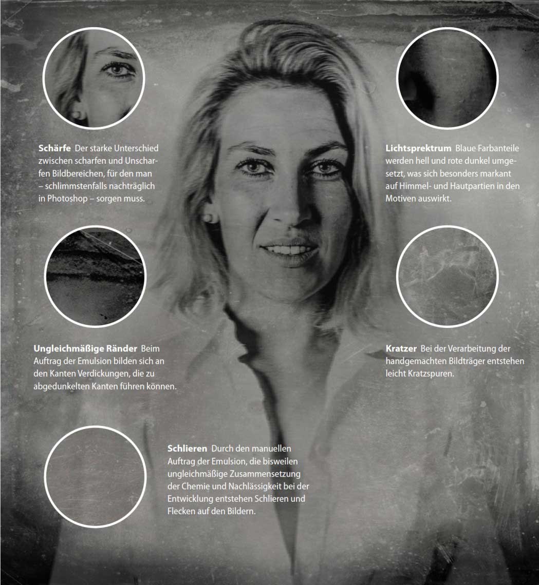 Mit der originalen Nassplattentechnik aufgenommene Fotos haben eine Reihe spezifischer Merkmale, die sich aus der eingesetzten Fototechnik und den Rahmenbedingungen des handwerklichen Fotoprozesses ergeben.