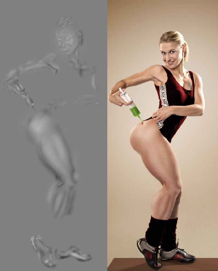 In diesem Bild sind alle für die Arbeiten von Drews typischen Stilmittel vertreten. Die Bearbeitung beginnt mit allgemeinen Hautretuschen und in diesem Fall speziellen Verformungen. Der Oberschenkel des Models entsprach nicht den Vorstellungen der Macher, und so wurde er mit den Werkzeugen des Verflüssigen-Dialogs in Dimensionen gebracht, die an die Frauenbein-Ästhetik des Comic-Zeichners Robert Crumb erinnern. Die im Anschluss erfolgten Farbkorrekturen konzentrieren sich zum einen auf Kleidung und Details, zum anderen würden Gesicht und Dekolletee weich aufgehellt. Der neutrale Hintergrund wird in Abstimmung mit dem Hautton umgefärbt und über Aufhellungsebenen mit einem weichen Spotlicht versehen. Den Abschluss der vierstufigen Vorarbeiten bilden die Einfärbung des Siegertreppchens und der Einbau von Textelementen.