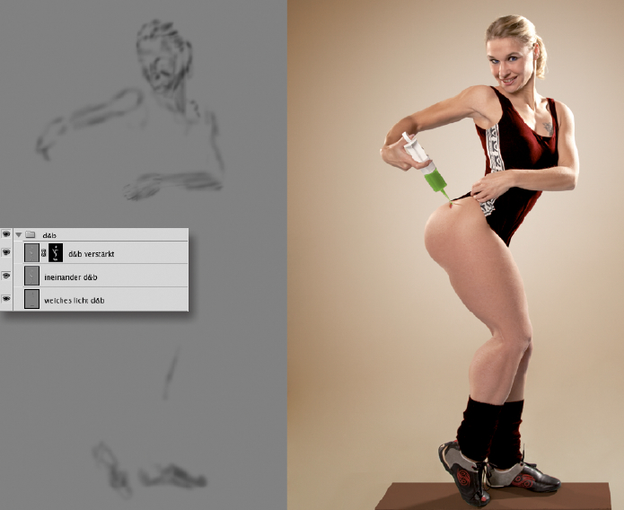 Die zweite, obere Ebene nutzt Drews in erster Linie, um die Lichter des Bildes zu intensivieren, aber auch für zusätzliche Schattierungen. Je nach Belichtung der Vorlage und Beleuchtung des Motivs setzt sie die Ebene meist auf „Ineinanderkopieren“ für einen stärkeren Effekt, oder gelegentlich auch auf „Weiches Licht“ für eine weniger augenfällige digitale Nachbeleuchtung. Gemalt wird auch hier wieder mit weicher Pinselspitze und geringer Deckkraft. Weiße Farbe hellt Lichter auf oder setzt neue Reflexionen auf Stellen, wo zuvor keine waren. Schwarze Farbe intensiviert vorhandene Schatten oder ergänzt den Schattenfall an Stellen, wo die aufgemalten Lichter nach den Regeln der Physik von Schattenwürfen begleitet sind. Sie sollten sich dieser Nachbeleuchtung zwar mit den Augen eines Fotografen oder besser noch mit denen eines Zeichners zuwenden, doch arbeiten die meisten Dodger & Burner eher nach ihrem Gefühl. Je besser das ausgebildet ist, desto eindrucksvoller werden die Ergebnisse. Solange man noch nicht sicher ist, welches Licht und welcher Schatten wie intensiv wohin muss, um einen bestimmten Effekt zu erreichen, sollte man diese Technik verhalten einsetzen.