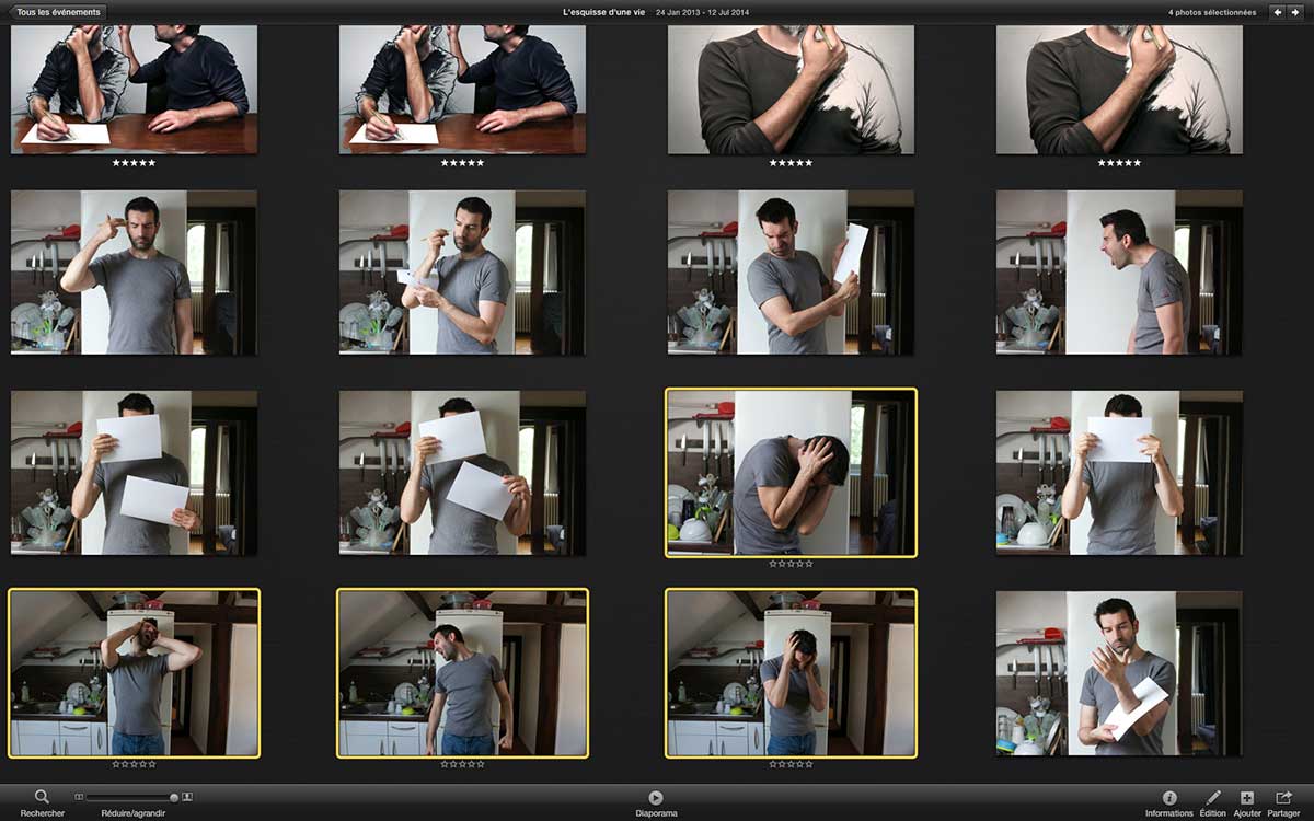 1. Beim fotografischen Teil dieser Arbeiten treibt Sébastien del Grosso, wie er erklärt, nur einen bescheidenen Aufwand: Die Porträts, die als Grundlage für meine Montage dienen sollten, habe ich mit dem vorhandenen Licht in meiner Wohnung aufgenommen; als Kamera diente eine Canon EOS 7D mit den Objektiven EF 16-35mm f/2.8L II USM und EF 50mm f/1.4 USM. Diese Ausgangsbilder waren natürlich noch weit von meinem angestrebten Ergebnis entfernt. Zur Sichtung und Organisation meiner Fotos nutzte ich iPhoto, aber die weitere Bearbeitung erfolgte dann in Photoshop. Bevor ich damit beginnen konnte, kam allerdings noch der entscheidende zweite Schritt, nämlich die Ergänzung der fotografierten Motive durch dazu passende Zeichnungen.