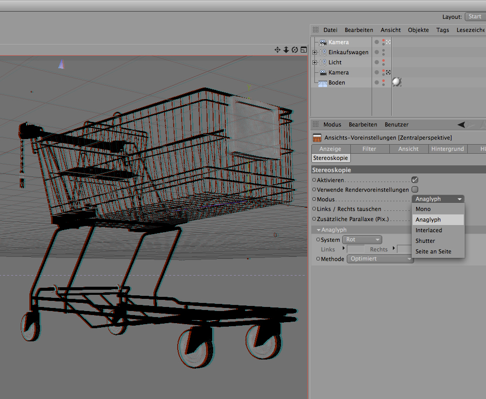 Ein weiterer Hit auf der langen Liste der Neuerungen ist die stereoskopische Kamera. Deren Wirkung können Sie bereits im Editor beobachten, wenn Sie die anaglyphische Brille aufsetzen. Was daran ganz besonders sexy ist: Selbst das Weltraster, das den Editor räumlich gliedert, ist der Dreidimensionalität unterworfen, zusammen mit der 3D-Achse, dem Rotieren- und dem Skalieren-Werkzeug. So lässt sich die 3D-Wirkung ohne zeitraubendes Testrendern bereits in der Konstruktionsphase feinjustieren. Unterstützt werden außer der anaglyphischen Methode der farbigen 3D-Brille auch die neuen 3D-Monitortechnologien sowie Shutterbrillen. Da Sie vermutlich noch vor einem 2D-Monitor Pixel und Polygone betrachten, sollten Sie vielleicht mit der farbigen Brille vorliebnehmen. Falls Sie die mit einem aussagekräftigen Gegenstand ausprobieren wollen: Hier finden Sie den links abgebildeten Einkaufswagen zum downloaden und experimentieren.