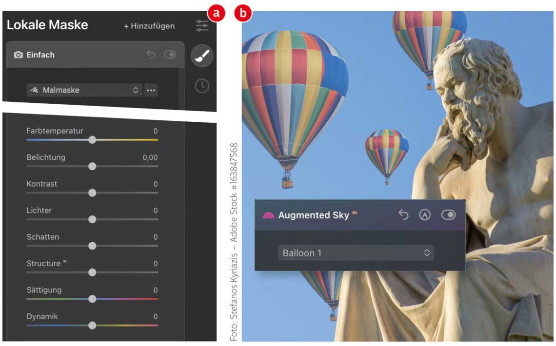 Ebenen wie in Luminar 4 kennt Luminar AI nicht mehr. Stattdessen gibt es die »Lokale Maske«, mit der man eine Handvoll Einstellungen (a) per Radial- und Linear-Verlauf sowie malend auftragen kann. Alle anderen Korrekturen und Effekte lassen sich in Luminar AI nur ein einziges Mal anwenden. Wenn Sie beispielsweise „Sonnenstrahlen“ zur Simulation mehrerer Lichtquellen oder über »Augmented Sky« mehr als einen Heißluftballon einfügen möchten (b), konnten Sie in Luminar 4 eine weitere Ebene erzeugen und den Effekt auf dieser wiederholen. In der Stand-alone-Software von Luminar AI ist das nur noch über einen destruktiven Workaround möglich: Sie müssen das Bild nach Anwendung einer Korrektur oder eines Effekts exportieren und die Datei wieder importieren, um die gewünschten Änderungen ein weiteres Mal benutzen zu können. Einfacher haben Sie es hier als Nutzer des Photoshop-Plug-ins: Wenden Sie den Luminar AI-Filter beliebig oft auf die (Smartobjekt-) Ebene an. In jedem Fall müssen Sie aber – anders als noch in Luminar 4 – den Dialog erst verlassen und wieder neu aufrufen.