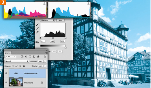 Nach der Umwandlung trägt der Dateiname am Kopf des Fensters die Endung „CMYK“, außerdem sehen Sie im Kanäle-Bedienfeld nun vier Kanäle. Und auch das Histogramm zeigt vier überlagerte Kurven [3, oben links]. Weisen Sie dem Bild eine »Tonwertkorrektur«-Einstellungsebene zu und gehen Sie zunächst oben zur Farbe »Magenta«; schieben Sie unten den Schwarzpunktregler von »Tonwertumfang« ganz nach rechts; das mittlere und das rechte Feld darunter zeigen nun beide den Wert 255. Wiederholen Sie das für »Gelb«. Das Ergebnis sehen Sie in Abbildung [3].