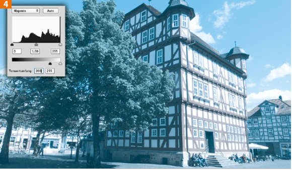 Allerdings wirkt das Bild so weniger verblasst als vielmehr bloß blau und entspricht wahrscheinlich nicht der Wirkung, die Sie erzielen möchten. Ich würde daher eher empfehlen, die Anteile von Magenta und Gelb auf diesem Weg nicht völlig zu eliminieren, sondern etwa ein Fünftel übrig zu lassen – der Schwarzpunkt des »Tonwertumfangs« steht dann also etwa auf 200. So bleiben noch schwache Reste von Rot-, Grün- und Gelbtönen übrig. Zudem könnten Sie die Werte von Cyan und Schwarz ein wenig absenken, indem der Schwarzpunktregler bei diesen beiden Farben ungefähr auf 30 gesetzt wird [4]. Weitere Alterungsmerkmale wie etwa eine schwache Strukturüberlagerung ergänzen gegebenenfalls die erwünschte Anmutung.