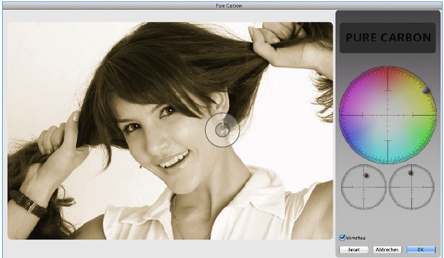 Nur auf dem Mac steht für GraphicConverter zusätzlich der Filter Pure Carbon zur verfügung, der Bilder in Graustufen umwandelt und zusätzlich färben kann. Die Lizenz ist im Kauf von Xe847 eingeschlossen. Im großen Reglerkreis können Sie eine Farbe wählen, die das Bild so verändert, als sei in der analogen Fotografie ein entsprechender Farbfilter verwendet worden. Der linke untere Regler optimiert Helligkeit und Kontrast. Nach einer Konvertierung in Graustufen müssen die meisten Bilder aufgehellt und mit mehr Kontrast versehen werden. Mit dem rechten unteren Regler können Sie das Bild beliebig einfärben. Die beliebten Sepiatöne liegen etwas links oben von der Mitte.