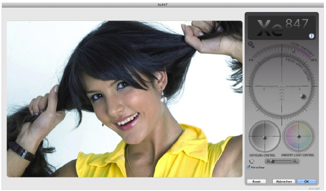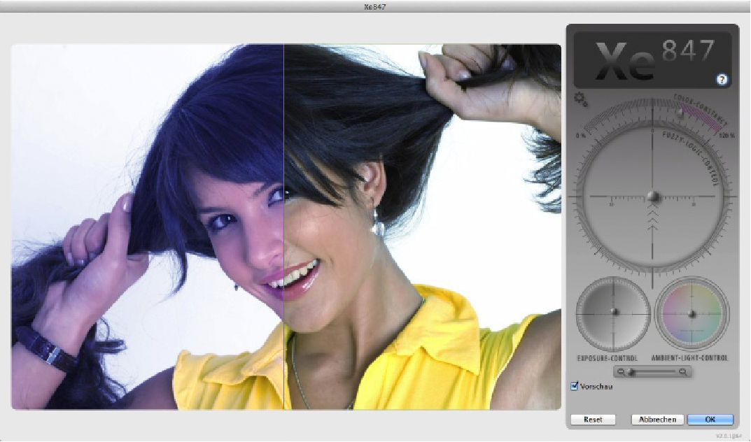 Der rechte untere Kreis nennt sich »Ambient-Light-Control« und beeinflusst direkt die Farbe. Dabei wird das Bild entsprechend der Hintergrundfarbe des Kreises verändert. Ziehen Sie die Kugel in unserem Beispielbild in die Gegenrichtung zum unteren blauen Bereich, um den verbliebenen Blaustich in den linken Randbereichen des Bildes und in den eigentlich schwarzen Haaren zu reduzieren. Im Dialog erkennen Sie die Position der Kugel im oberen linken Bereich als Vorschlag. Mit etwas Übung können Sie Farbstiche mit Xe847 beseitigen, ohne lange mit der »Farbbalance« von Photoshop experimentieren zu müssen.