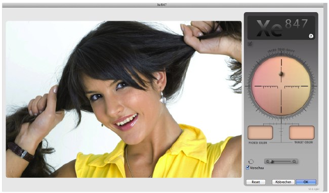 Auch für Photoshop-Anwender (ab CS5, auf einem Intel-Mac und ab OS 10.6) steht der Filter in einer angepassten Version als Plug-in unter www.xe847.com zum Preis von 34,95 € zur Verfügung. Öffnen Sie ein problematisches Bild und rufen Sie Xe847 über das Filter-Menü auf. Im montierten Titelbild [1] sehen Sie links, wie das Bild vorher aussah, und rechts die automatische Korrektur durch Xe847. Die Griffkugel im großen Kreis zeigt keinen absoluten Wert an, sondern steht zunächst immer in der Mitte. Das Besondere an Xe847 ist nämlich, dass seine Algorithmen erkennen, ob ein Farbstich vorliegt und welcher. Entsprechend wird das Bild vorkorrigiert. Im zweiten Schritt kommt der Anwender ins Spiel, um das Ergebnis zu verfeinern und dem eigenen Geschmack anzupassen. Dabei setzt Xe847 auf Intuition, was zunächst für manchen Anwender ungewohnt sein dürfte. Dieser alternative und schnelle Weg zum Ziel ist aber immer einen Versuch wert.