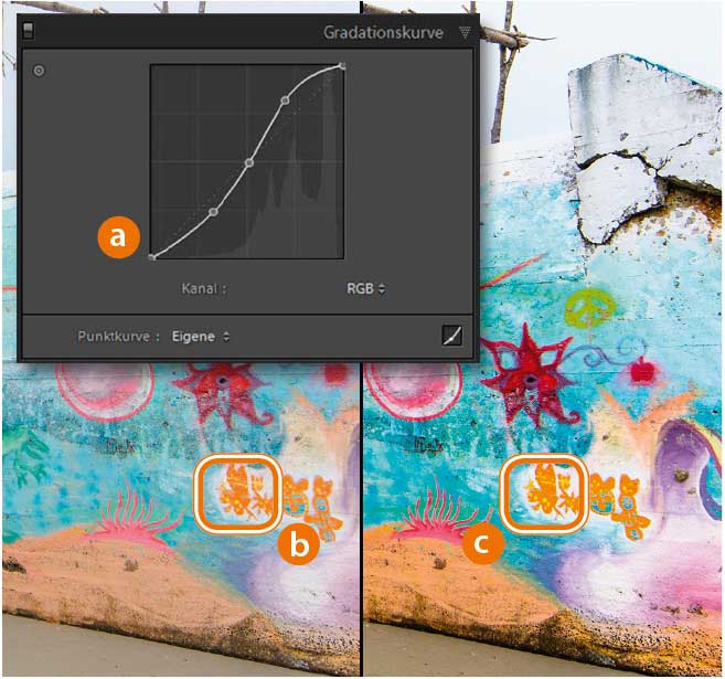 Erhöhen Sie im Bedienfeld »Gradationskurve« über eine typische „S-Kurve“ (a) den Bildkontrast, so erhöhen Sie zugleich die Sättigung im Bild. Im Beispielbild ist die Sättigung auf den orangen Figuren bei cirka 75 % (b) und im kontrastverstärktem Bild bei 100 % (c). Denselben Effekt erhalten Sie auch über den Regler »Kontrast« bei den Grundeinstellungen.