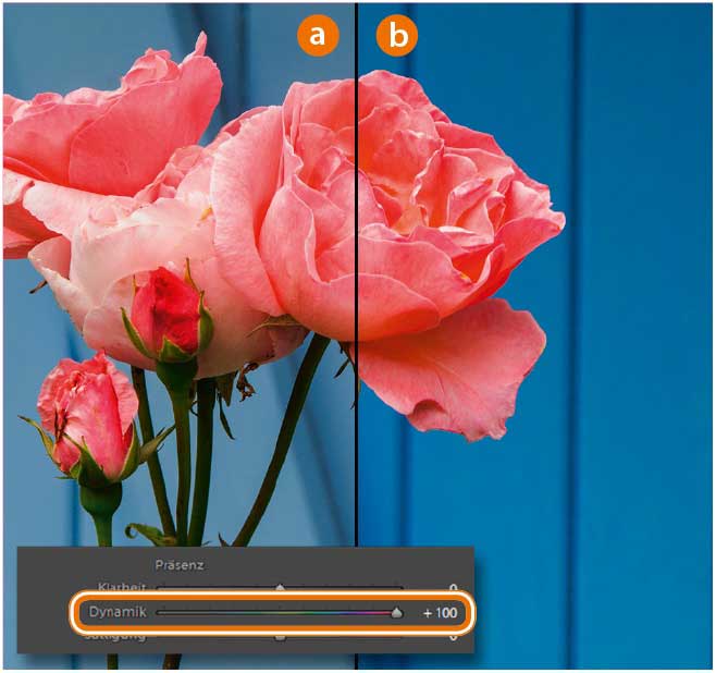 Die »Dynamik« erhöht die Farbsättigung, dabei wird die vorhandene Sättigung berücksichtigt und vor allem werden die wenig gesättigten Farben verstärkt. Damit vermeiden Sie extrem gesättigte Bereiche. Im Vergleich von Original (a) und einer Variante mit 100 % »Dynamik« (b) sehen Sie, dass der hellblaue Hintergrund verstärkt wird, die Rosen aber nur wenig.