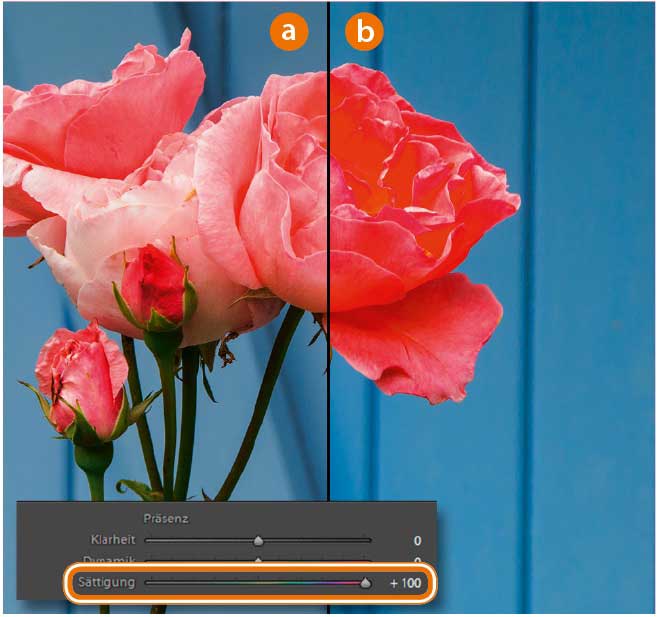 Der Regler »Sättigung« verstärkt alle Farben gleichmäßig, schon gesättigte ebenso wie fast unbunte Farben. Das Ergebnis erscheint oft unnatürlich. In grauen Flächen kann es durch Anhebung der »Sättigung« zu Farb-Artefakten kommen. Extreme Werte führen bei gesättigten Motiven wie den Rosenblüten (a) zum Clipping in ein oder zwei Farbkanälen – hier im Rotkanal (b).
