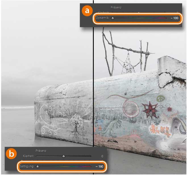 Die Steuerelemente »Sättigung« und »Dynamik« lassen natürlich auch das Reduzieren der Sättigung zu. Entsprechend den dahinterliegenden Algorithmen erhält man dabei über die »Dynamik« ein sehr niedrig gesättigtes Bild (a), das aber immer noch Farbwerte enthält. Reduziert man hingegen die »Sättigung« auf –100, so erhält man ein Graustufenbild (b).