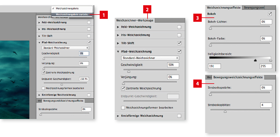 LÖSUNG: Mit diesem Problem sind Sie nicht der Einzige. Vor allem auf vielen Windows-PCs werden anscheinend bei den Filtern der Weichzeichnergalerie oft nicht alle Paletten angezeigt. Diese Filter haben (erfreulicherweise!) keinen klassischen Dialog mehr, sondern rufen einen entsprechenden Arbeitsbereich mit individuellen Bedienfeldern auf, so das man weiterhin am Bild in voller Größe arbeiten kann. Hierbei scheint es mitunter zu Problemen zu kommen. Die Lösung ist sehr einfach, wenn auch etwas versteckt: Klicken Sie oben rechts auf das Dropdown-Feld » Weichzeichnergalerie« und wählen Sie dann die dort einzig verfügbare Option »Weichzeichnergalerie zurücksetzen« [1]. Daraufhin sollten Sie alle drei verfügbaren Bedienfelder des Filters vorfinden: »Weichzeichner-Werkzeuge« [2], »Weichzeichnungseffekte « [3] und »Bewegungsweichzeichnungs effekte« [4]