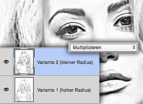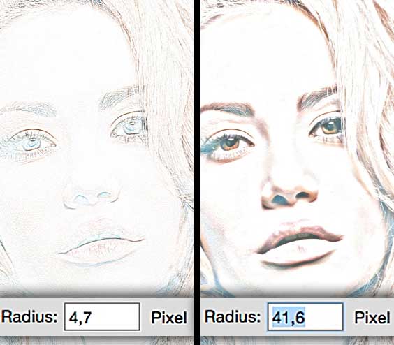 Durch das Anwenden des Weichzeichnungsfilters »Gaußscher Weichzeichner« lassen Sie die Konturen des Ausgangsbildes sichtbar werden. Bei kleinen Radien erhalten Sie sehr feine Konturen (in der Abbildung links), je größer Sie den Radius wählen, umso flächiger fällt das Ergebnis aus (rechts). Finden Sie hier zunächst einen Radius, der die Hauptkonturen der Person optimal darstellt.