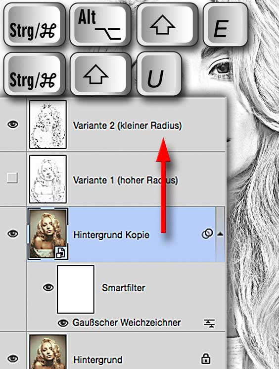 Der aus den ersten beiden Schritten resultierende Ebenenaufbau erleichtert das Anlegen verschiedener Detailvarianten. Haben Sie einen passenden Radius für die Konturen im »Gaußschen Weichzeichner« gefunden, bestätigen Sie diesen und drücken danach »Strg/Cmd-Alt-Shift-E«, um das Ergebnis auf einer neuen Ebene zu fixieren. Entsättigen Sie die Ebene mit »Strg/Cmd-Shift-U«.