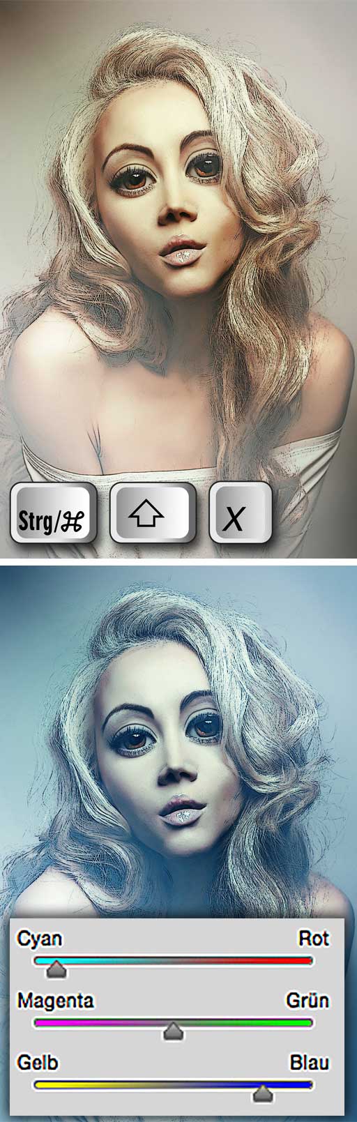 Die hier vorgestellte Technik macht aus einem Foto noch keinen Comic. Aber denken Sie doch etwas um die Ecke! Setzen Sie vor dem Zeichnungseffekt den »Verflüssigen«-Filter (»Strg/Cmd-Shift-X«) ein, um die Mimik und die Proportionen im Ausgangsfoto lustiger zu gestalten. Die notwendigen Grundlagen für den »Verflüssigen«-Filter lernen Sie in der Photoshop-Akademie in DOCMA 63 ab Seite 60 kennen. Gehen Sie danach die einzelnen, hier vorgestellten Schritte durch. Hier habe ich den „Zeichnungseffekt“ nur mit etwa 50 % Deckkraft der Verflüssigen-Ebene einzelnen Bildstellen überlagert. Für die Farbtonung legen Sie eine Einstellungsebene »Farbbalance« an, in der Sie die »Mitteltöne« in Richtung Blau und Cyan verschieben.
