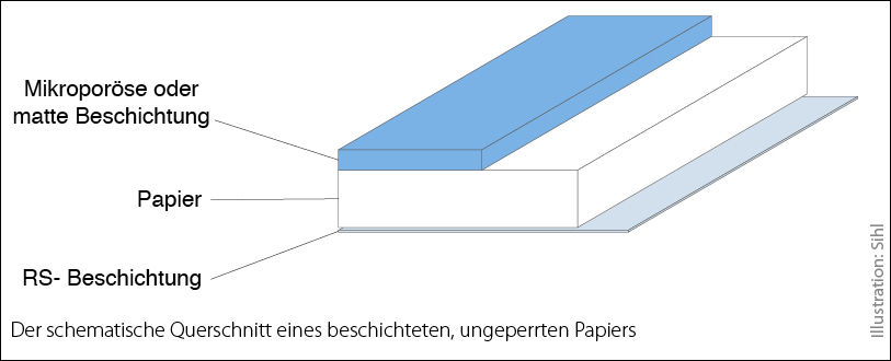Wie der Querschnitt in der Abbildung rechts zeigt, fehlen bei den ungesperrten Papieren die PE-Schichten. Durch das Weglassen dieser Sperrschicht erhält man eine ganz eigene Anmutung. Während ein gesperrtes PE-Fotopapier vielen wie eine Folie erscheint, hat man bei den hochwertigen ungesperrten Fine-Art Medien das Gefühl, ein „echtes Papier“ in der Hand zu halten. Das Material fühlt sich weich und sanft an und vermittelt auch durch die häufig verwendete naturweiße, leicht gelbliche Färbung ein Gefühl von Wärme und Behaglichkeit. Darum werden Papiere dieser Art häufig für harmonische, weiche Motive eingesetzt.