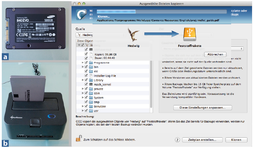 Der zeitaufwendigste Teil des Umbaus ist die Übertragung der Daten von der Festplatte auf die SSD. Eine geeignete Software für Windows liefert Samsung mit. Unter OS X könnten Sie den Weg über ein Time-Machine-Backup gehen; ich entschied mich für „Carbon Copy Cloner“ (www.bombich.com). Ich schloss die SSD [a] mit einem Adapter [b] an das MacBook Pro an, erzeugte mit Carbon Copy Cloner eine Recovery-Partition auf der SSD und kopierte dann den Festplatteninhalt darauf. Wegen der langsamen USB-2.0-Verbindung nahm das einige Stunden in Anspruch, aber danach war die SSD ein Spiegelbild der Festplatte und brauchte nur noch eingebaut zu werden.